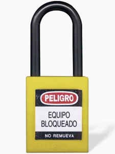 Candado de seguridad para procedimientos de bloqueo y etiquetado (LOTO), utilizado para aislar fuentes de energía y prevenir accidentes durante el mantenimiento de equipos.