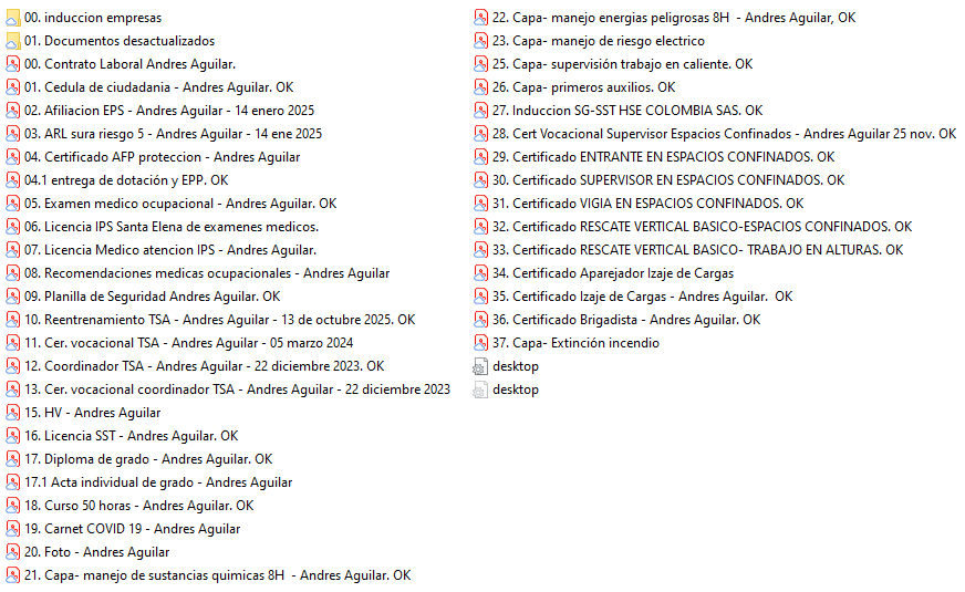 • Gestión de Riesgos: Registros de inducción corporativa, actas de entrega de Elementos de Protección Personal (EPP) y certificados de cursos técnicos o de capacitación realizados.